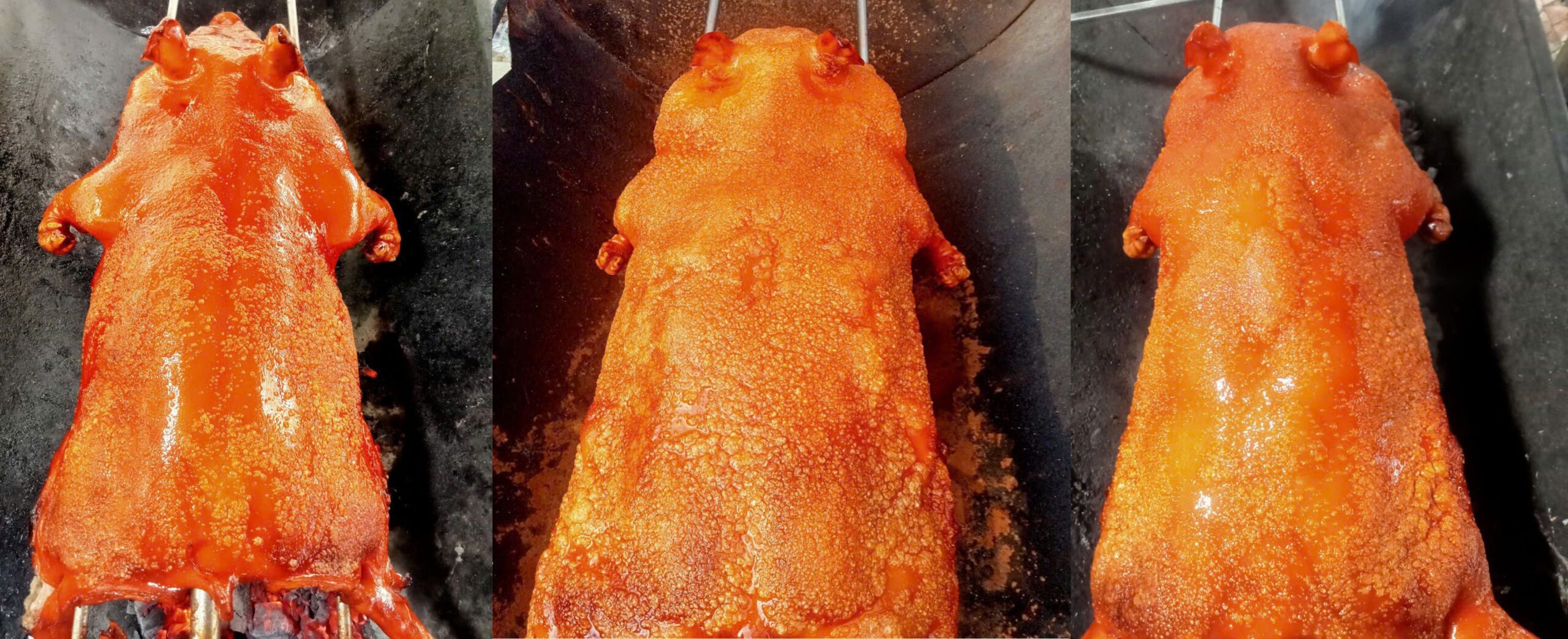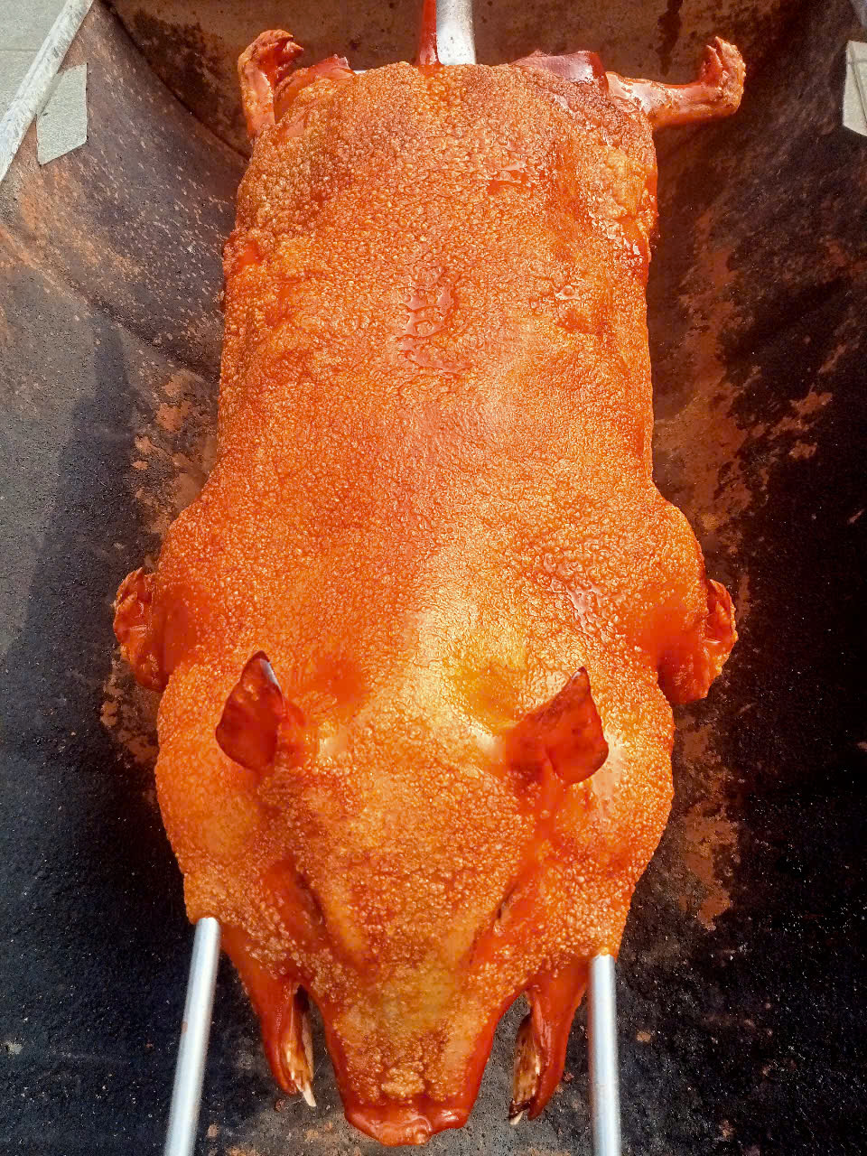 Được quay thủ công bằng than hồng, từng miếng thịt chuyển màu nâu óng đẹp mắt, lớp da nổ đều, giòn rụm – tạo nên hương vị đặc trưng không thể trộn lẫn.