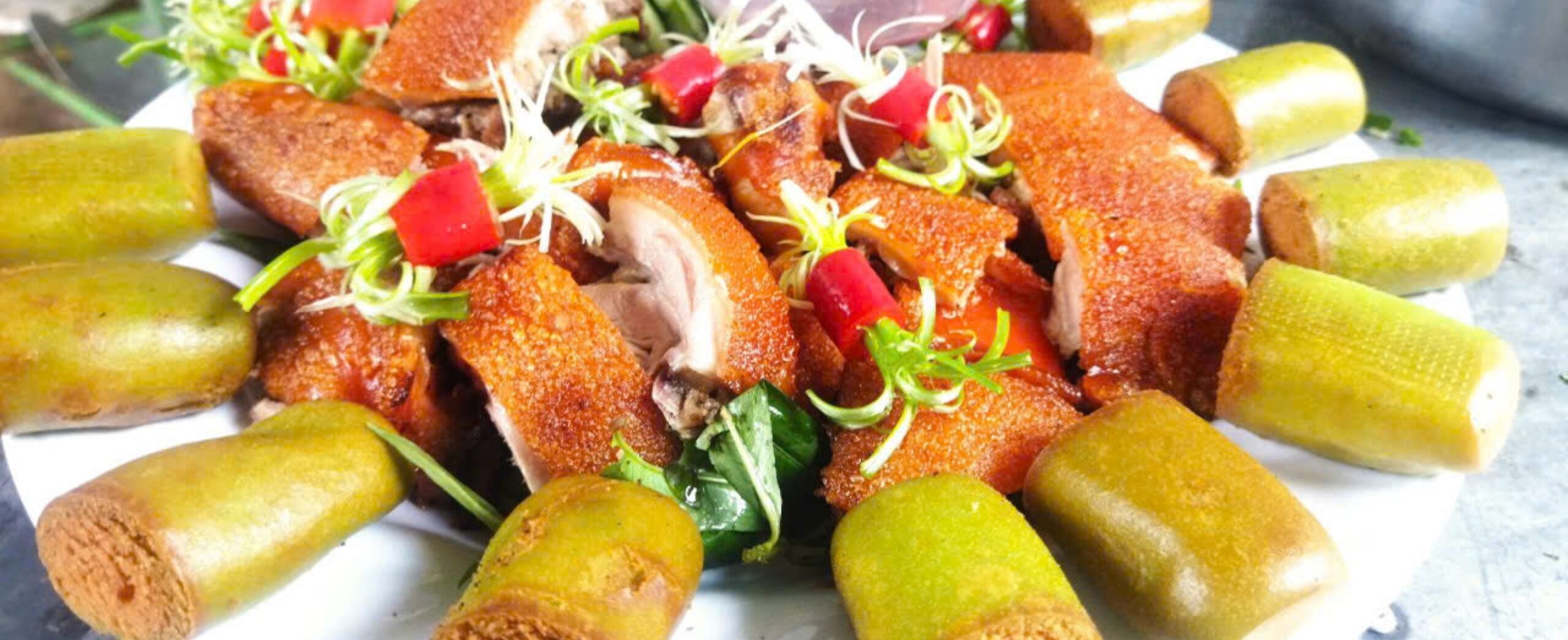Heo quay da giòn như bánh tráng, thịt bên trong chín mềm, ngấm đều gia vị – kết hợp hoàn hảo giữa vị béo, mặn, ngọt và cay nhẹ của nước chấm.