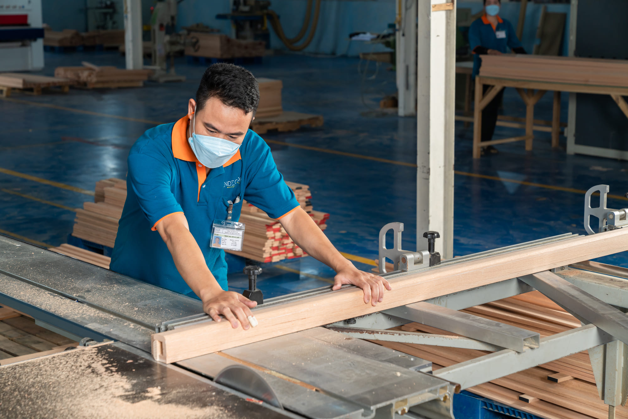 Công đoạn cắt phôi sẽ giúp loại bỏ những khuyết tật tự nhiên của gỗ và đưa những bán thành phẩm về đúng kích thước mong muốn theo yêu cầu của người kỹ thuật.